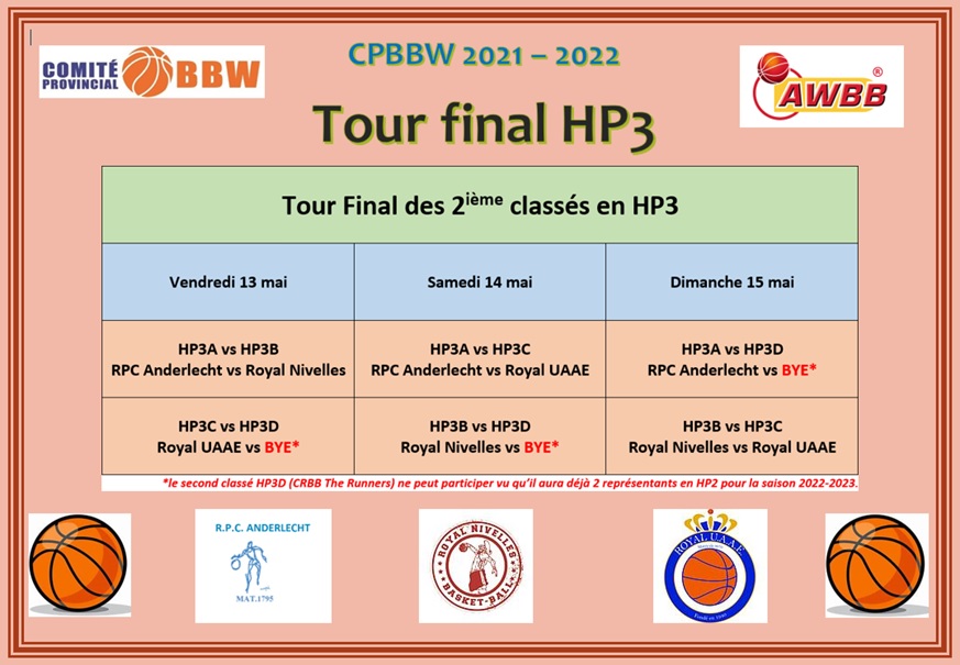 Tours Finaux HP3 01/05/2022 A la lecture des classements finaux, nous constatons que le CRBB The Runners aura déjà 2 représentants en HP2 pour la saison 2022-2023, en conséquence leur participation au Tour Finale des second classé en HP3 n’a aucun sens.