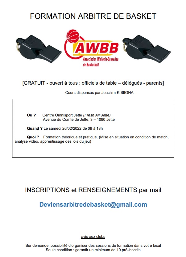 Comme vous l’avez sans doute vu dans la dernière NL de l’Awbb, les inscriptions pour le nouveau cours d’arbitrage en E-learning sont ouvertes. Ces inscriptions se font via le MyAwbb : – dont voici le lien direct : https://myawbb.be/posts/arbitre – la marche à suivre : Voici la procédure d’inscription : 1) Tapez myawbb.be dans votre navigateur internet. [...]